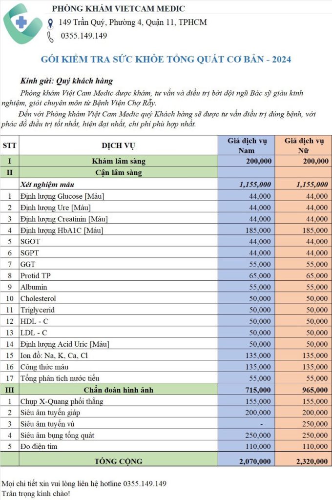 HomeDịch vụ khámKhám sức khỏe tổng quát chuyên sâu Khám sức khỏe tổng quát chuyên sâuDịch vụ khám / 29/07/2024 29/07/2024 Phòng khám Việt – Cam Medic Địa chỉ: 149 Trần Quý, Phường 4, Quận 11, Tp. Hồ Chí Minh Hotline: 0903-981-999 Email: vietcammedic@gmail.com